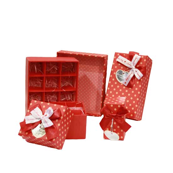 This is a series of gift box that is available in different sizes and shapes. Each stylish gift box comes in an allover red hue and is accented with small white dots. Adorned with ribbon ornament, this gift box collection is ideal for packing assorted gifts.