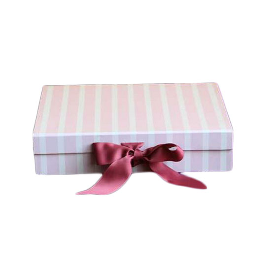 This is a gift box with a striped pattern. It is adorned with a bowtie at the front for a lovable touch. It is a nice choice to present your gift with this gift box.