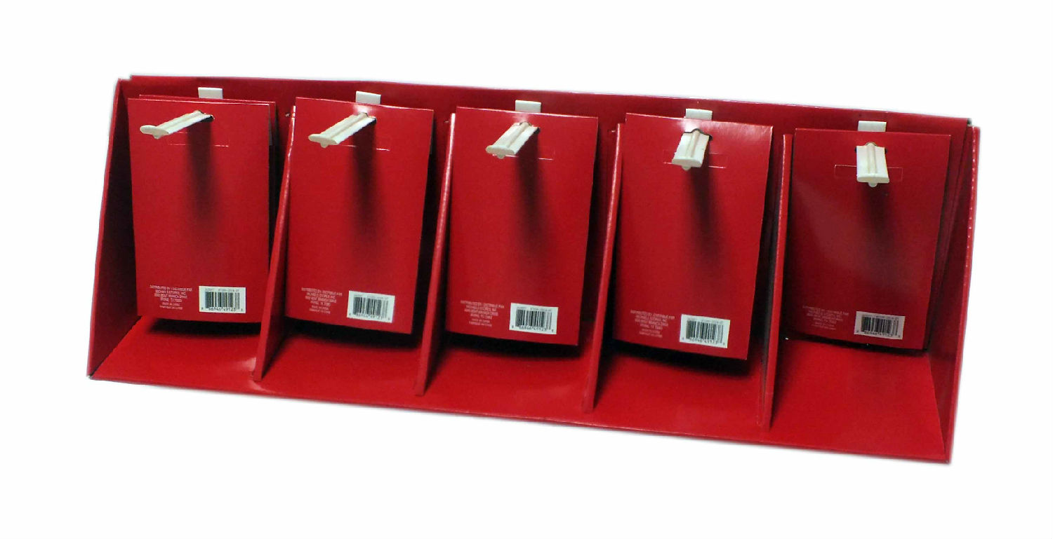 - Red tray with five pegboard hooks for hanging the gift boxes.