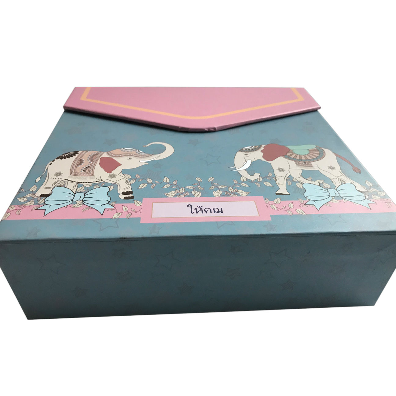 This envelope-like gift box boasts a sturdy construction in hard cardboard. Boasting a nice design with fancy elephant prints, matte lamination, and heart-patterned interior, it offers a nice idea to present your gifts for special occasions. A magnetic flap lid keeps the contents secure yet easy to reach.