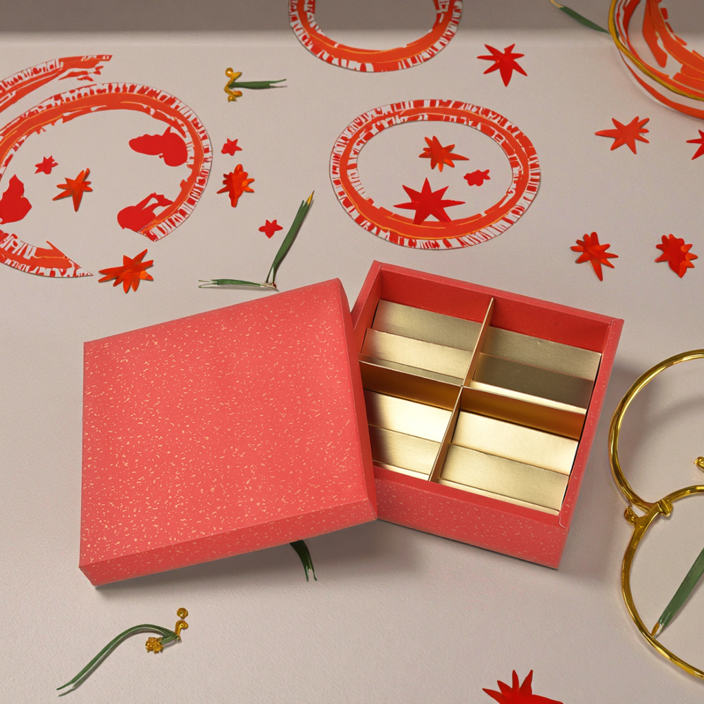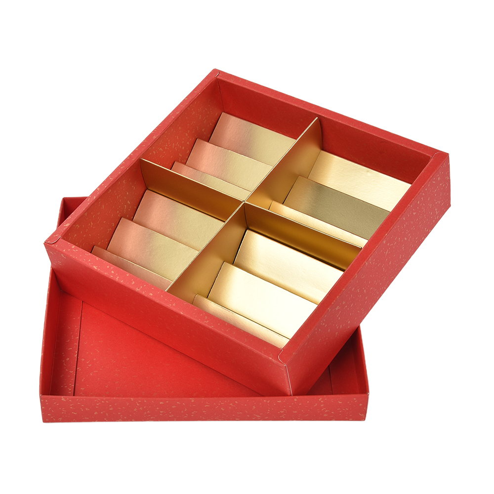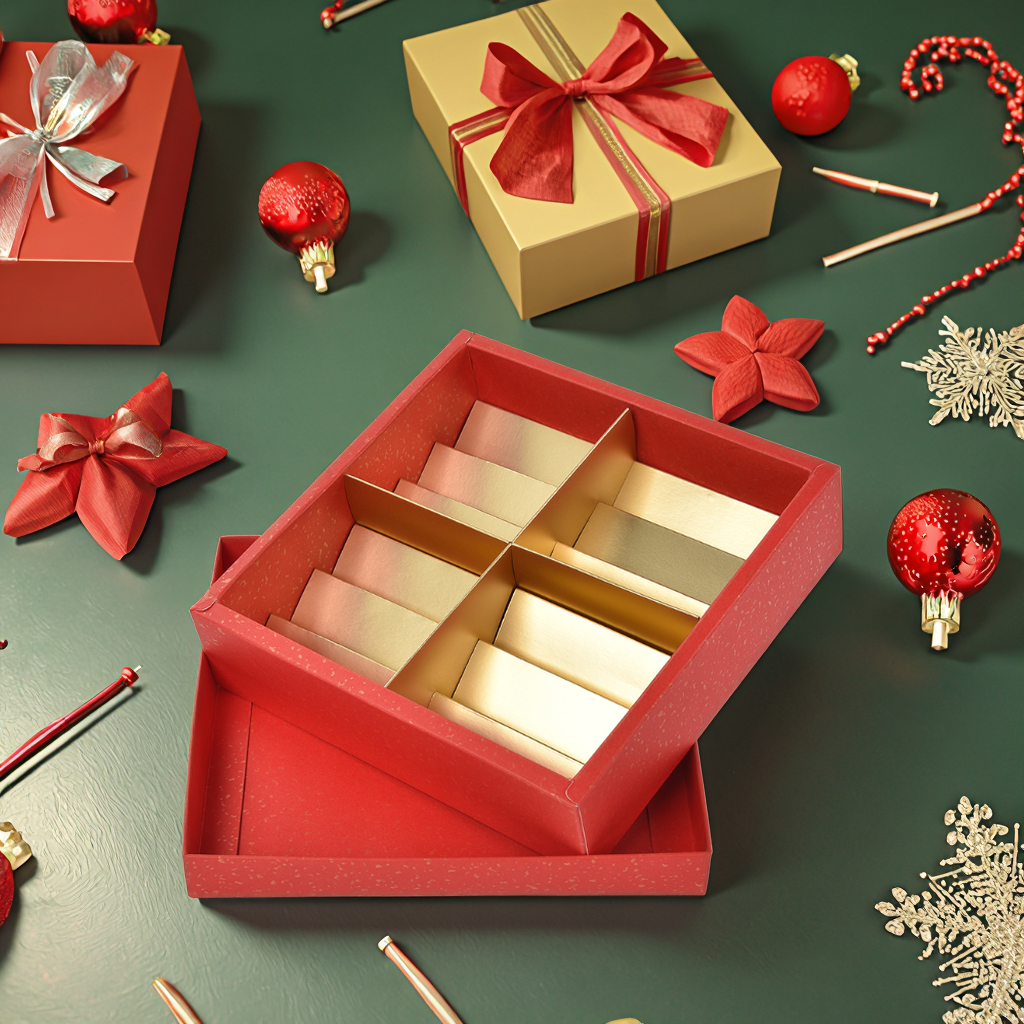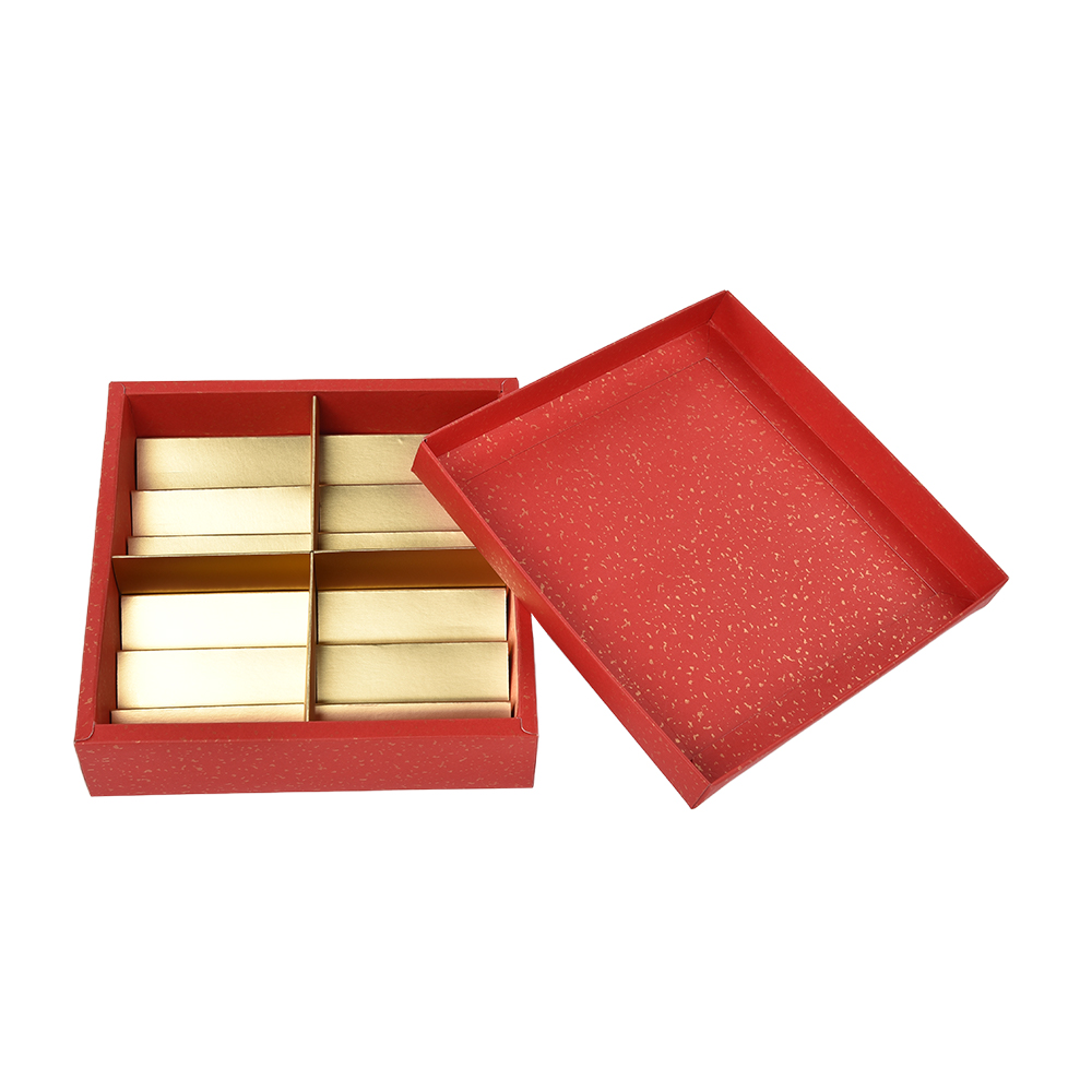 A high-end red square gift box. There is golden grid cardstock inside, specially designed for exquisite small items such as gifts, chocolates and candies. The box body is made of thickened hard cardboard. The surface is covered with a touch film and combined with gilding/embossing processes, presenting a light luxury texture. The interior is divided into four compartments, enhancing the sense of ceremony for storage. It is an ideal choice for festival gifts and brand customization.