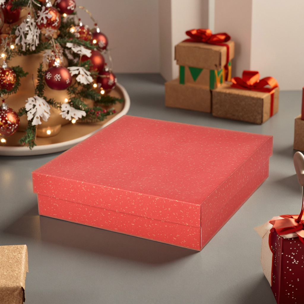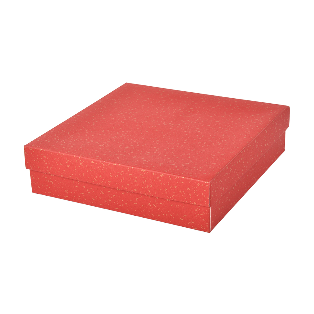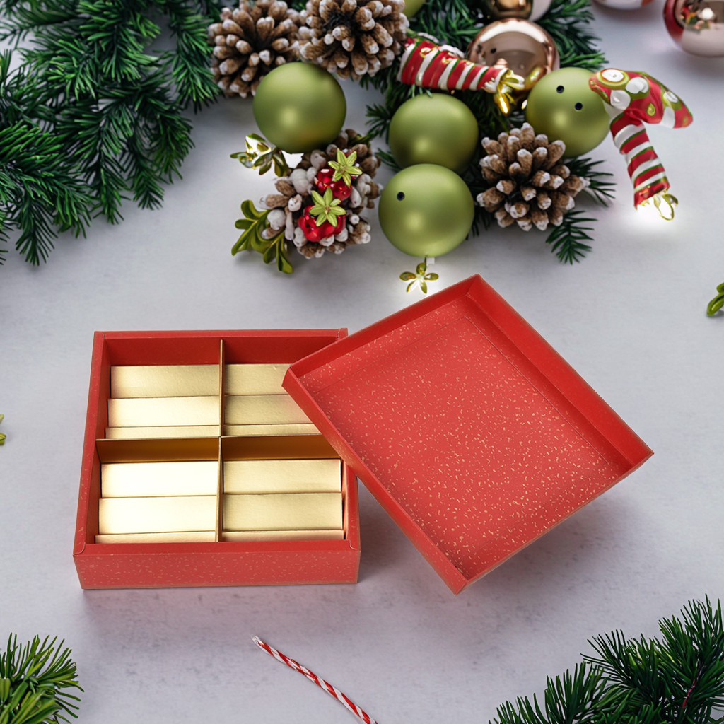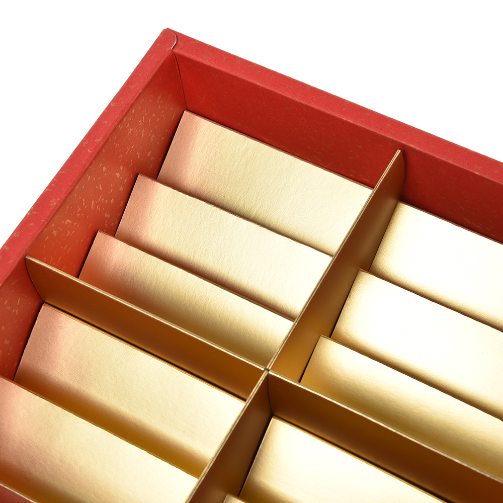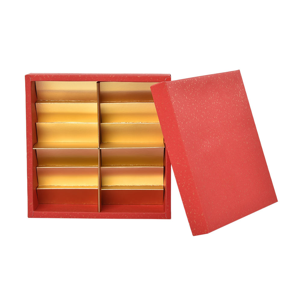 A high-end red square gift box. There is golden grid cardstock inside, specially designed for exquisite small items such as gifts, chocolates and candies. The box body is made of thickened hard cardboard. The surface is covered with a touch film and combined with gilding/embossing processes, presenting a light luxury texture. The interior is divided into four compartments, enhancing the sense of ceremony for storage. It is an ideal choice for festival gifts and brand customization.