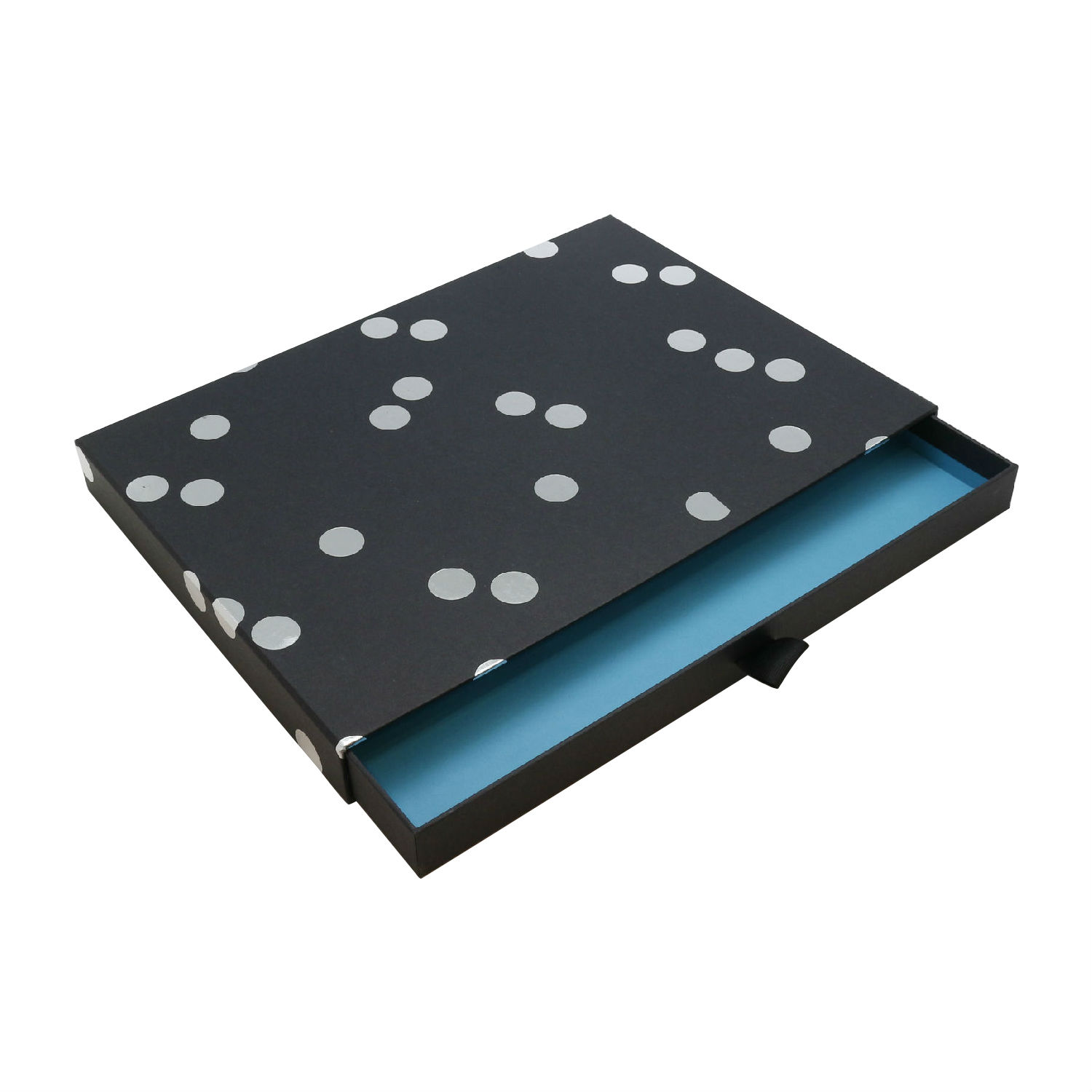 Keep your accessories organized with this gift packaging box. The flat and rectangular create comes in a drawer-like design of slide closure and depicts a grosgrain ribbon loop for added expediency. Its silvery foil dot exterior further hints a luxurious charm to adorn tabletops.