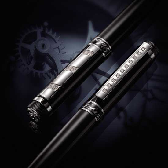 Featured is a collection of jewelry writing instruments. The polished black finish is decorated with sparkling jewels. This practical and luxurious pen makes a fine choice of gift on special occasions.