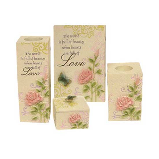 The featured gift set comes with two vertical pencil stands, a note book and a small jewelry box. They feature the theme "Love" and are adorned by drawings of roses. The gift set is perfect for ladies' use.