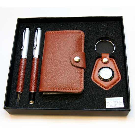 The delicate stationery gift set includes a ball pen, a roller pen, a key chain pouch and a key chain watch. The gift set comes with a matching silver and cherry finish and is finely packaged in a square gift box. Impress your clients with this stylish and unique gift set!