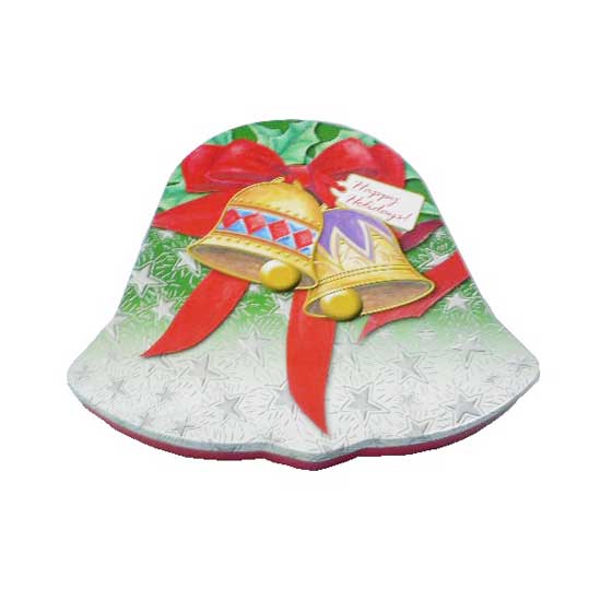 This is a gift box designed in a Christmas bell shape. The box is also designed with bell patterns in vivid and sharp colors. The food grade ink and tinplate material allows it to be used as a food contact container.