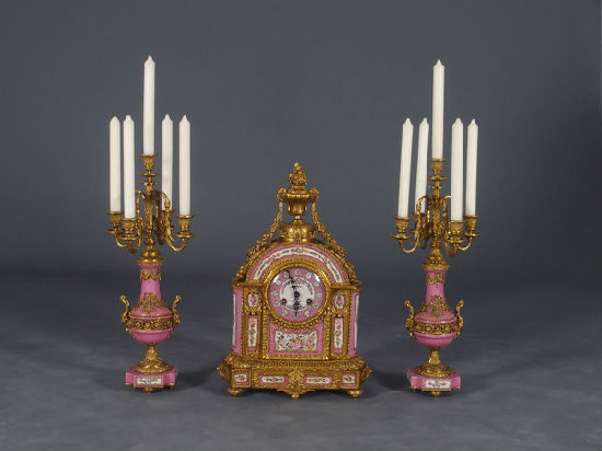 A Gilt-Bronze and Pink Ground Sevres Style Porcelain Mantel Clock with Candelabra