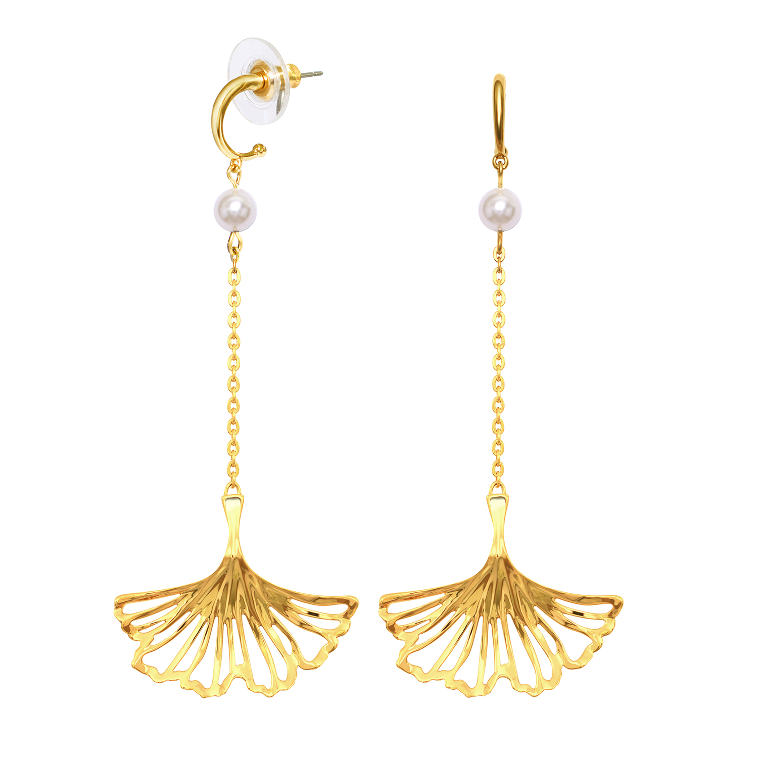 Show up as a goddess at end-of-the-year parties with this pair of drop earrings. Dropping down from the pearl-like detail is a delicate gold ginkgo leaf for an ethereal and elegant look, while the exquisite craftsmanship is shown through its fan-like shape and wavy edges that mimic the leaf’s finely ribbed texture. Pair this feminine and alluring piece with a white sheer chiffon dress to complete your ethereal goddess look.