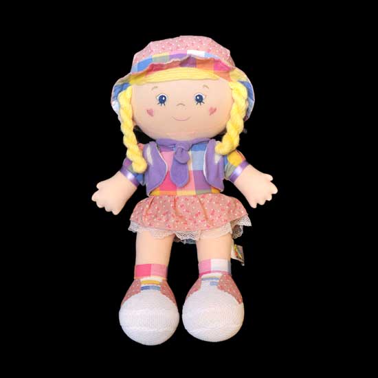 This lovely girl doll wears a beautiful dress and matching hat. The top-quality doll is finely made with exquisite details. It is a great huggable friend for your children.