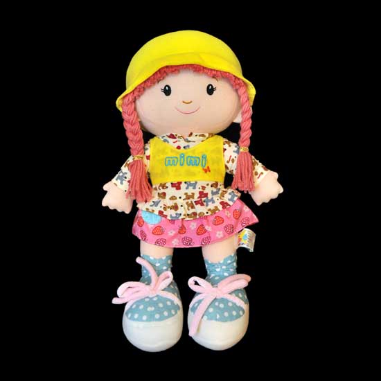 This cute girl doll features a smiling face with red braided hair. It wears a colorful dress and a bright yellow hat. This doll is a lovable character to play with, encouraging fun and inspiration.
