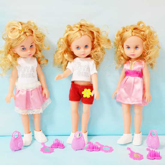 Displayed is a blonde girl doll that has long and curly hair. With multiple sets of attire available, you can have fun changing clothes for the doll to create different looks. This doll also comes with a cosmetic bag with a mirror and a comb.