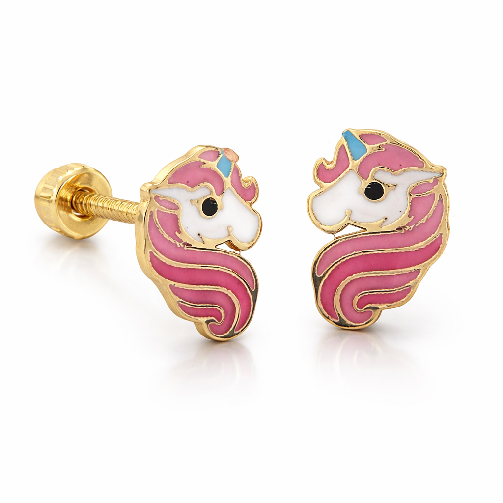 Each earring features a beautifully contoured unicorn silhouette with soft enamel accents that enhance its expressive character. The smooth polished gold outline highlights the fine detailing, while the vibrant enamel colors add a touch of fantasy and elegance without compromising sophistication.