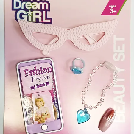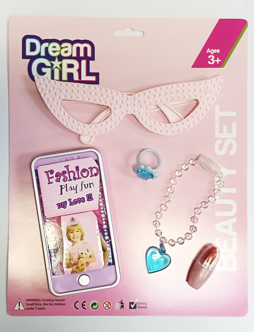 Girl beauty set , play set with mobil phone , glass . ring , lipstick on card