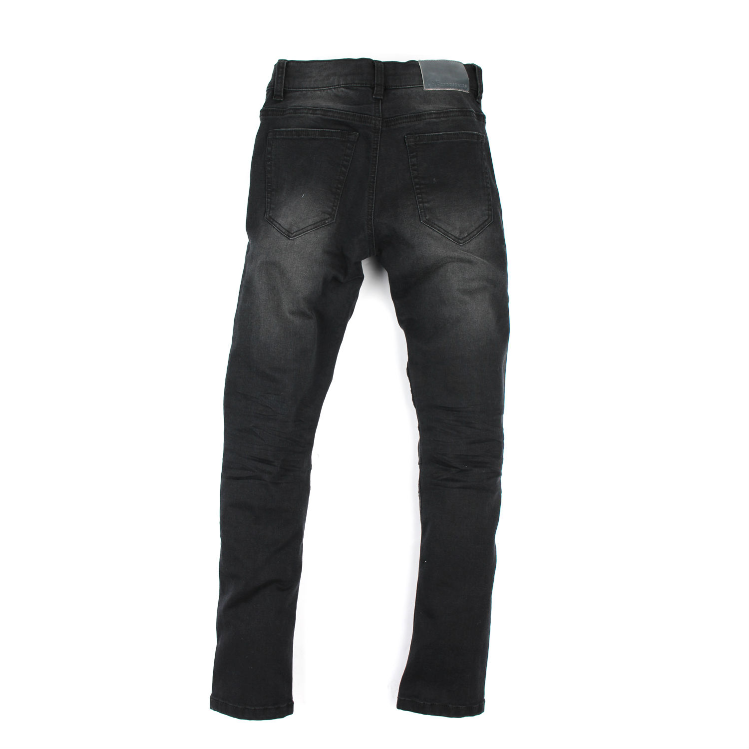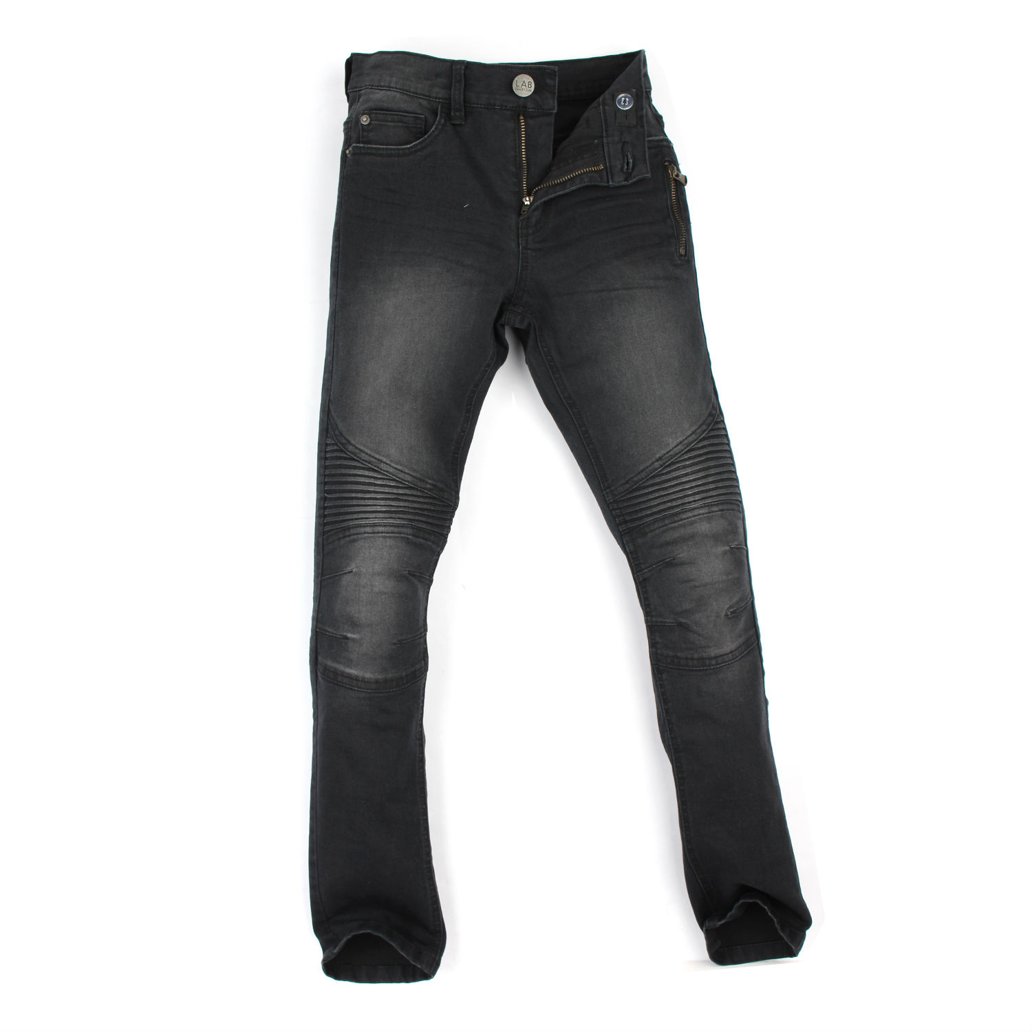 - Etched front tack button closure and zip fly.