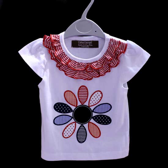 This girls' blouse is designed with red striped ruffle detail along the round neckline. A charming flower-shaped pattern decorates the garment in the front. The cap-sleeved cutting ensures wearers' comfort.