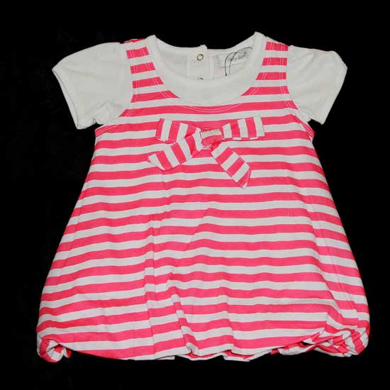 The girls' dress is utterly weaved of cotton for wearing comfort. It is styled with stripes in vivacious colors. The front of it showcases a dainty knot.