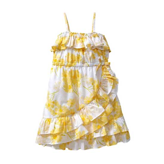 This is a girls' dress that comes in a lovely yellow color. With spaghetti straps, this dress showcases a ruffled bustline and hem. This beautiful girls' dress is made of cotton cambric for comfortable wearing.