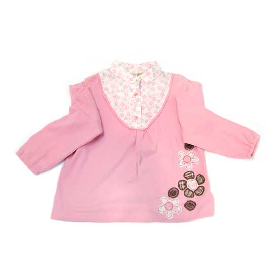 This girls’ long-sleeved T-shirt in pink features a white shirt collar with floral patterns. The big floral patterns at the side accentuate the look easily. This fashionable cotton T-shirt is suitable for kids of 4 years.