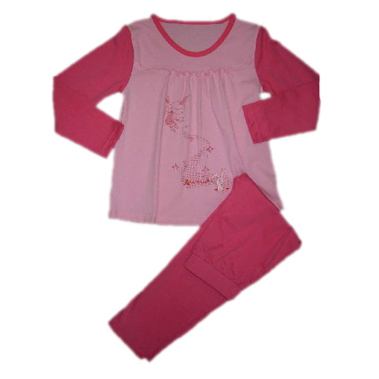 Showcased here is a pair of girls’ long pajamas including a T-shirt and a pair of pants. The pair features a red and pink exterior, which is sure to win over your little girl’s favor. The long-sleeved T-shirt with a lovely print on the front for added style.