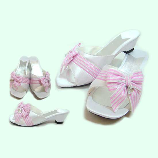 These lovely girls' party sandals are accented striped ribbon bows on the white uppers. The sandals feature a slip-on style for easy wearing. The pretty sandals are perfect to accessorize any party dress.