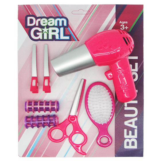 Give your little princess a stylish hairstyle with this hair dryer and brush play set. The set includes hairdressing accessories including a hair dryer, a hairbrush, a pair of scissors, two hair rolls and two hair clips. The hairdressing accessories have rounded edges for safety and can help develop the creativity and fine motor skills of children through pretend play.