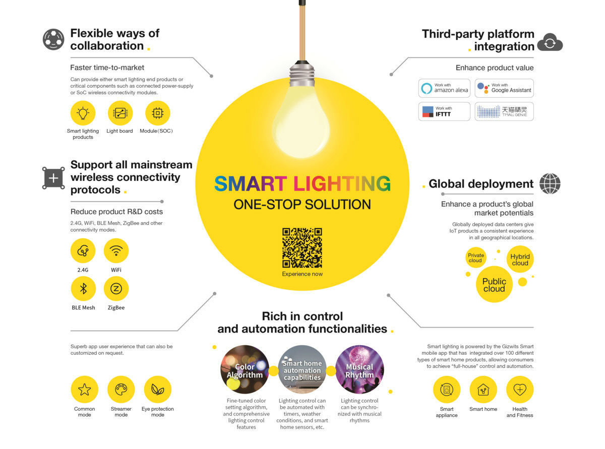 Gizwits Smart Lighting One-stop Solution consists of communication module, cloud connectivity, and Gizwits Smart mobile APP (Hereinafter referred to as GSmart APP). It provides either smart lighting end products or critical components such as connected power-supply or SoC wireless connectivity modules to help enterprises shorten time-to-market. The smart lights can be voice controlled or conditional interacted with Amazon Echo, Google Assistant, Tmall Genie, IFTTT and other mainstream smart speakers or other third-party platforms. Not only being stable in the connectivity, but also being rich in the control and automation functionalities of color algorithm, smart home automation capabilities, and musical rhythm, the smart lighting powered by GSmart has integrated over 100 different types of smart home products, allowing consumers to achieve full-house control and automation.