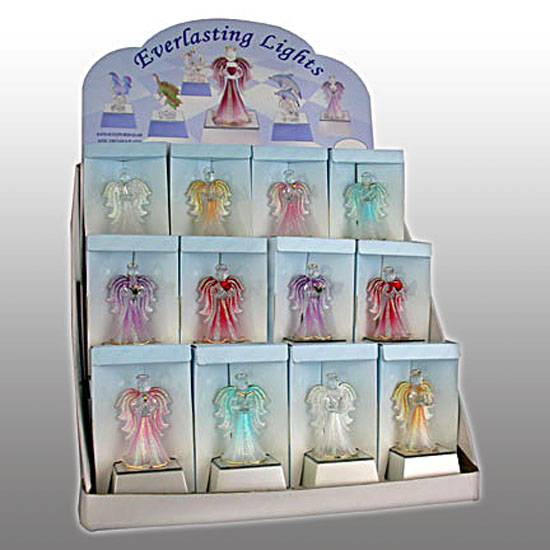 The glass angels feature a subtle glow in assorted colors such as purple, red, yellow, blue and and white. They are delicately crafted for an impeccable touch. Give your blessing to someone special with this glass angel.