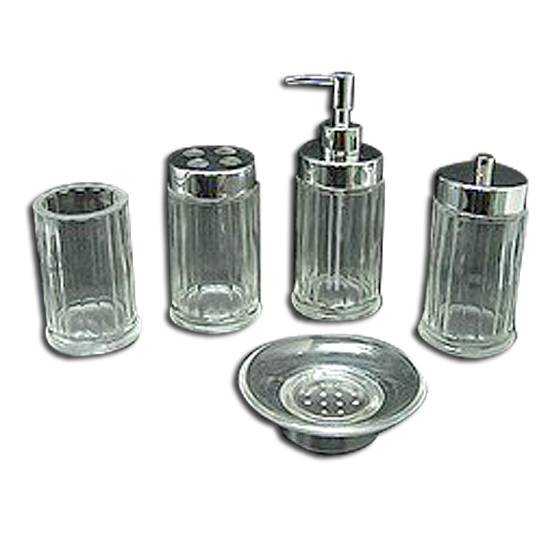 These set of bathroom accessory include soap holder, toothbrush holder, glass jar, liquid soap dispenser and jar with lid. They are all made of glass. Metal parts in silver color enrich style of these accessory.