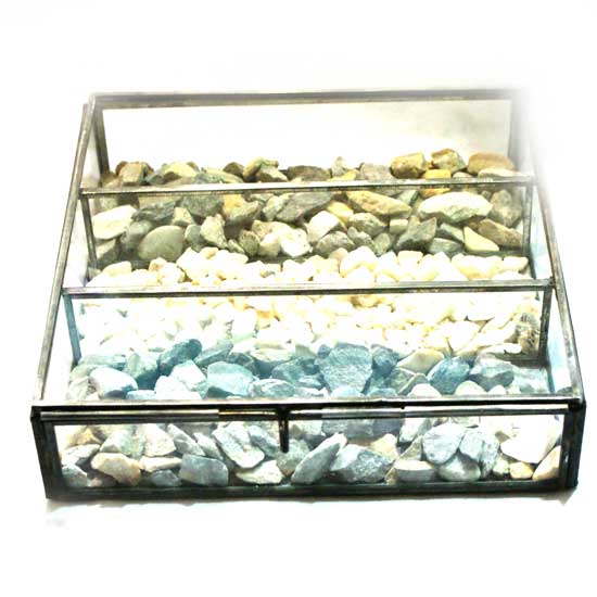 Displayed is a glass box that allows a full glimpse of the contents. The rugged iron construction offers lasting durability. The three separate compartments allow systematic displaying of your trinket.