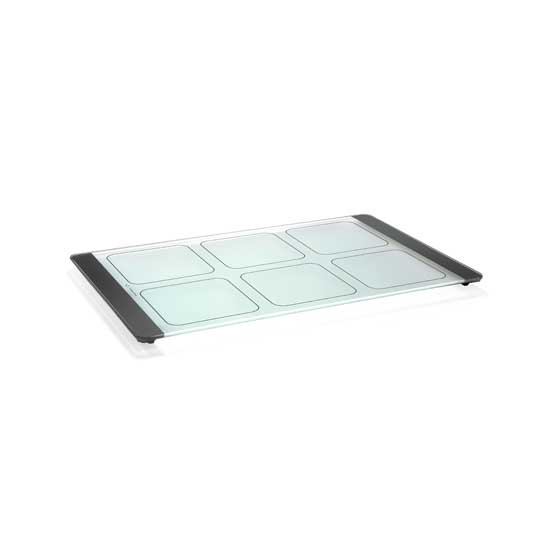 This unique chopping board is made of top-grade tempered glass for a long service life. The surface of the glass can be able to withstand high temperature, but four plastic feet only resist 80-degree Celsius hot water. The glass chopping board can be used in conjunction with sinks. It can be washed up by dishwater.