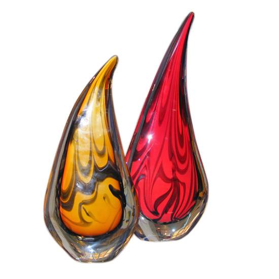 These are a selection of glass decoration. The glass decoration are intricately made in an beautiful organic form. These glass decoration feature a sculptural quality. The inner body of the glass ornament encases fiery amber and deep red tones in the form of flowing strokes. These glass decorations are made by glass blowing technique. The glass decorations are an ideal ornament.