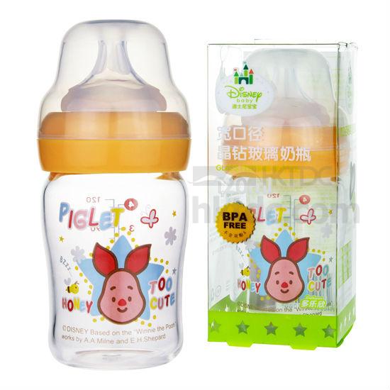 • Crystal-clear glass bottle with colorful piglet print and volume marks.