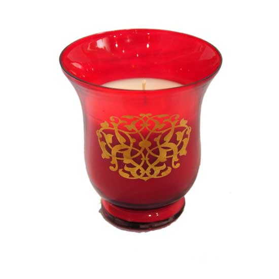 This glass-filled candle boasts a unique cup shape with vanilla fragrances. This fragrant candle comes in vivid red with golden printed patterns for an eye-catching look. The candle radiates comfortable light and adds a harmonious touch to your living environment.