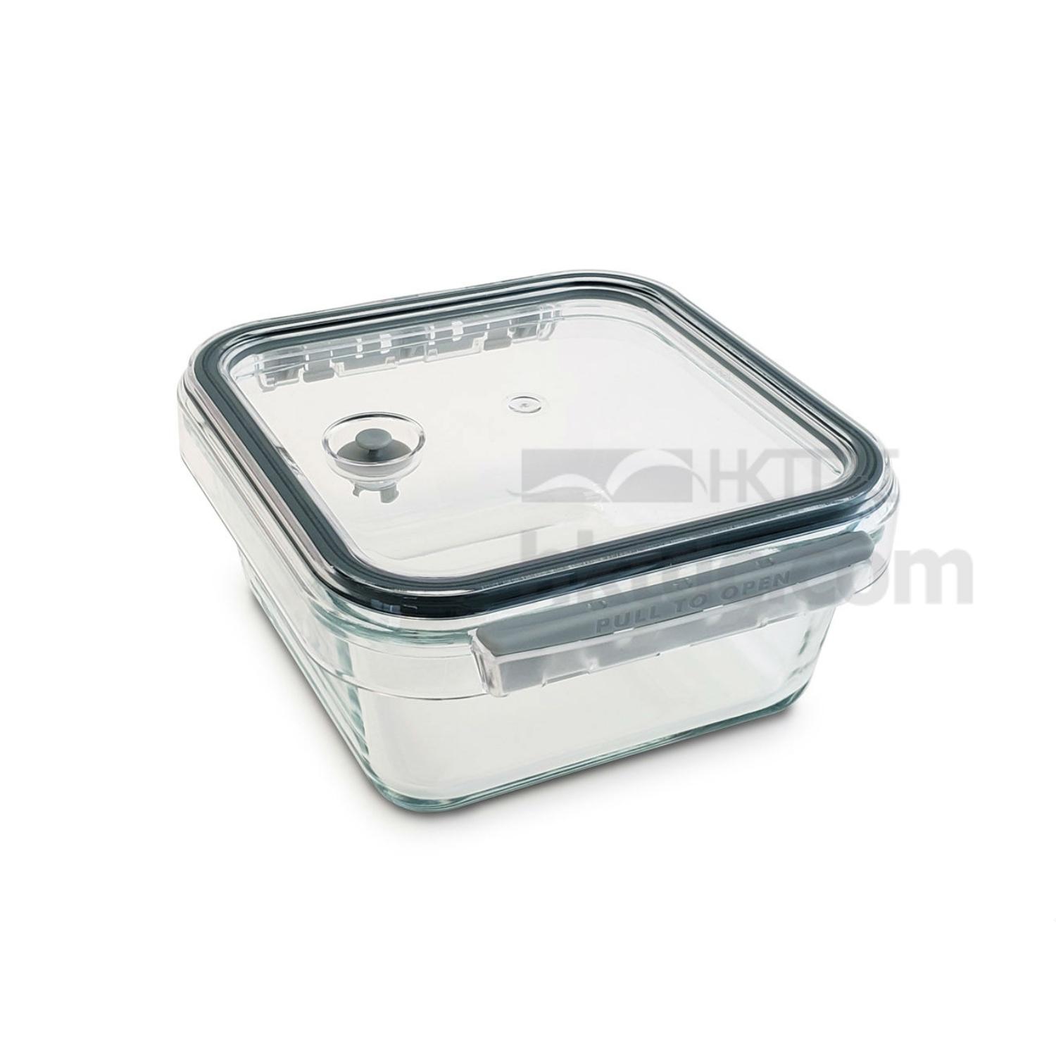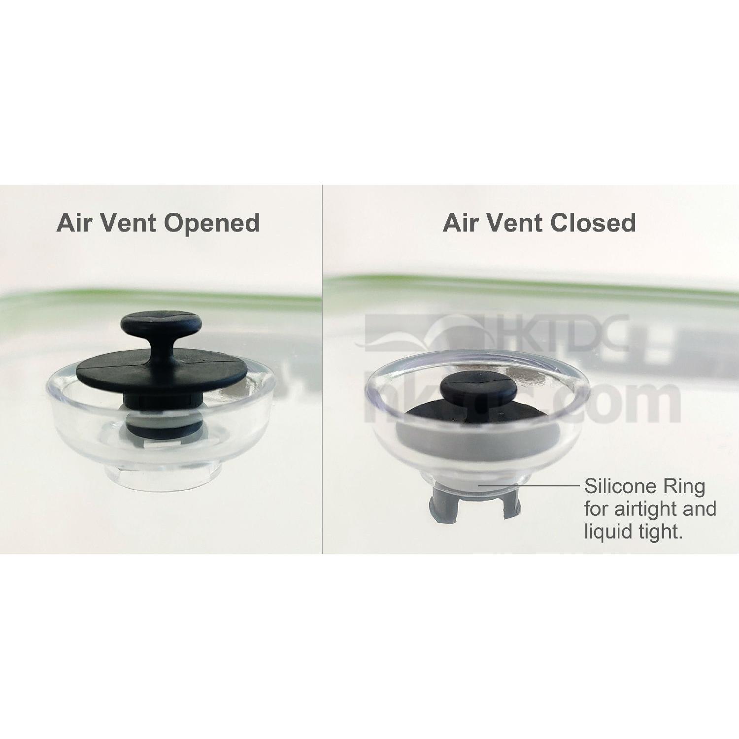 Keep food fresh with this air tight and liquid tight sealable borosilicate glass food container. It has a spacious clear compartment for storage and has a tritan lid with a valve. This food container is equipped with a patented pull handle to open mechanism and is microwave safe, oven safe (heat resistance up to 500°C), freezer safe and dishwasher safe.