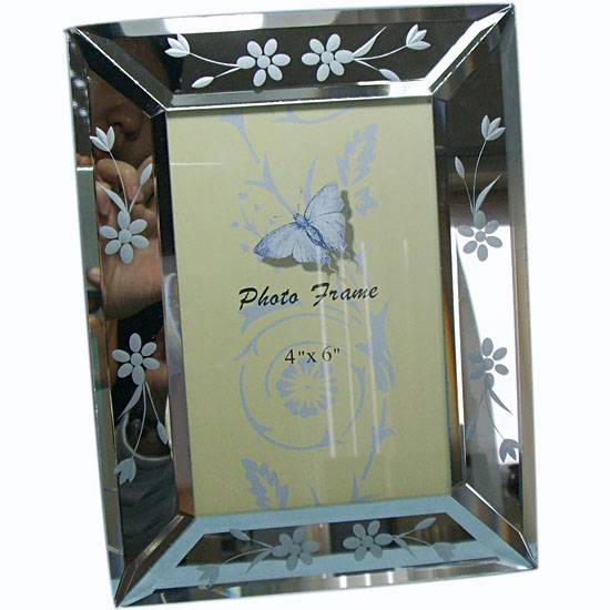 This is a photo frame in a vertical style. It features a sleek, silvery mirror frame decorated with floral patterns, adding a splash of color to the frame. This pretty photo frame makes a great item to complement any household setting.