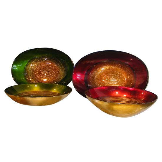 These plate and bowl sets include large plates and bowls with artistic decoration. The use of golden color and high gloss finish give a luxurious feel to these items. Finishing touch with irregular spiral line at the center further enhance their look.