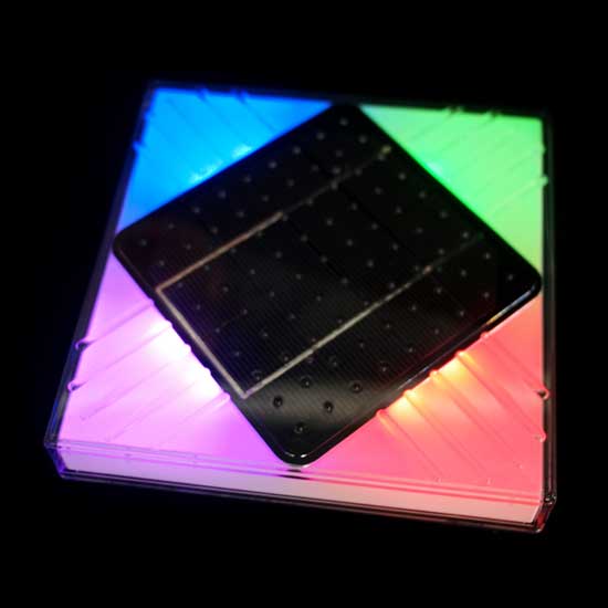 This glass solar tile delivers colorful lighting effects on the four corners. It does not require electric power and is an energy saving choice. The high-quality design ensures reliable performance and a long service life.