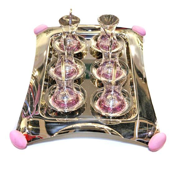 This is a tea set which includes 12 glasses, 12 spoons and a stainless steel tray. There are frosted or ground circle patterns on each cup.