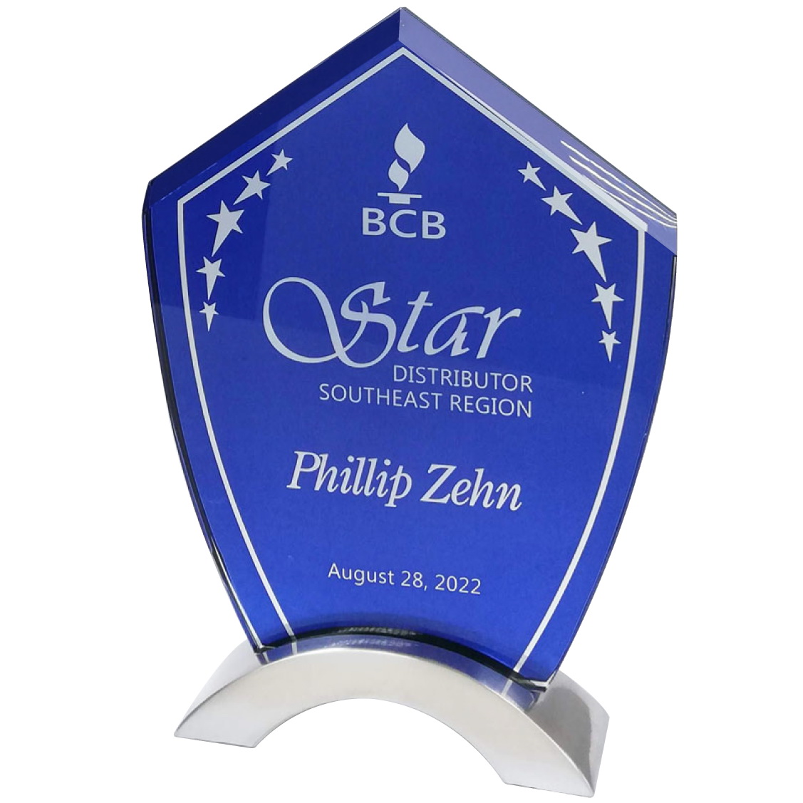 Glass upright with bevelled edges and blue printing; Aluminum base in silver; Direct engraving on the glass; For peronalisation and award.