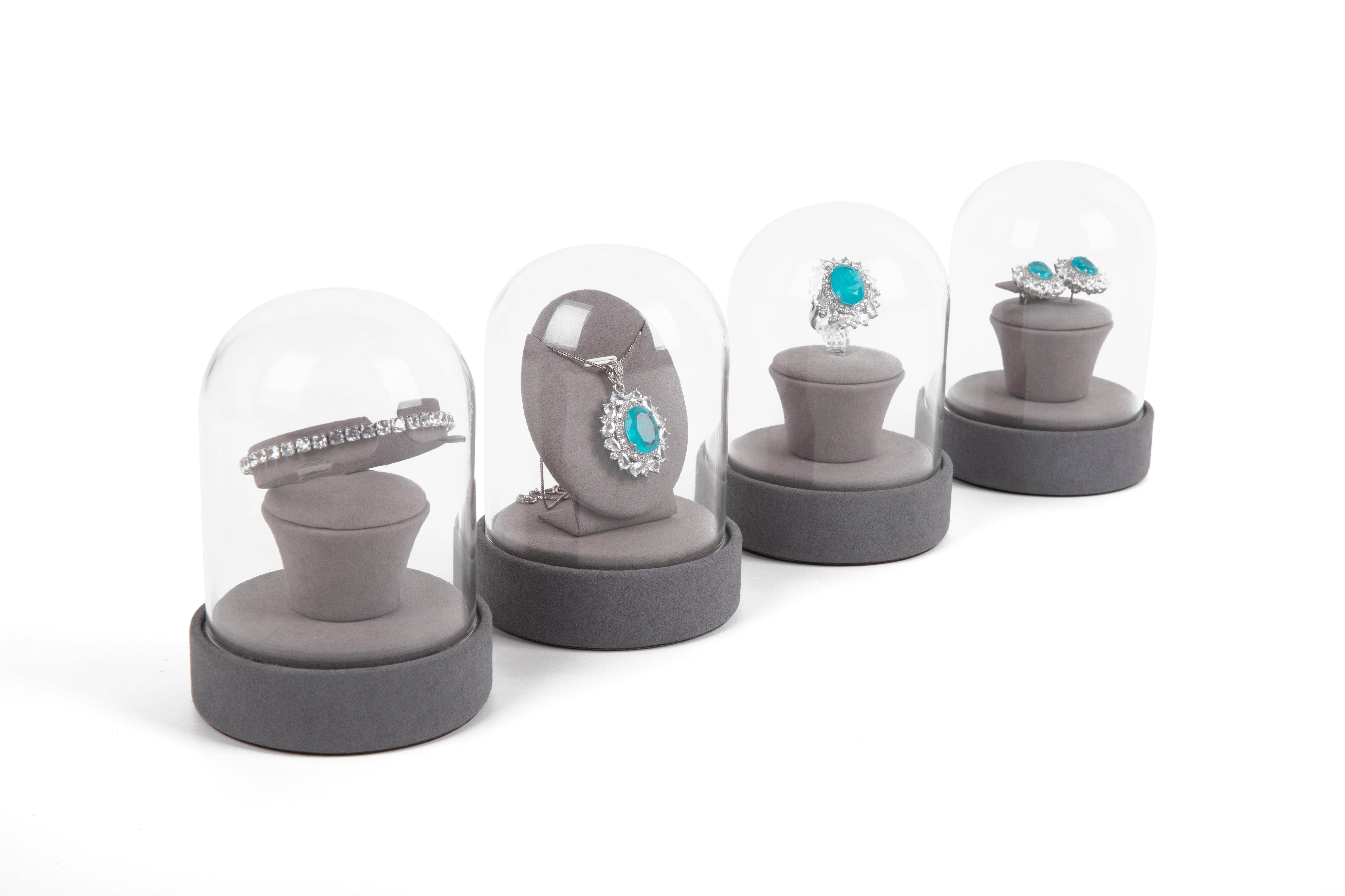 Glass jewellery display, crafted from glass and microfibre. Compact in size, exquisitely designed for showcasing jewellery. Customisable with logos and materials.
