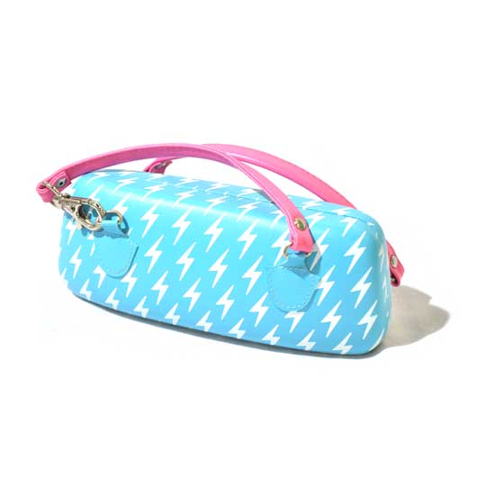 This glasses case sports a captivating white lightning pattern in a light blue background. It is complemented with baby pink handles linked by lobster clasps for easy carrying. This stylish spectacle case protects your glasses from physical damage.