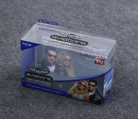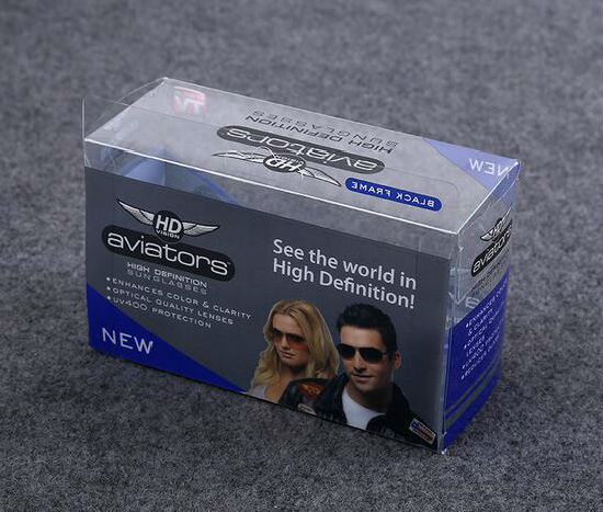 The standard quadrangular contour of this packing box blends pellucid casing with printed promotional silhouettes to attract eyes. Its thin header is further accented with a hanging hole for easy display in stores, keeping your glasses away from all kinds of moisture, dirt and stains.
