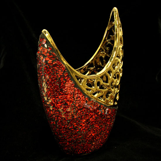 This delicately crafted vase features a rare hollow design. Made with a combination of patterned, colored surface, this vase is mysterious and intriguing. This distorted U-shaped vase makes a unique addition to your home decor.