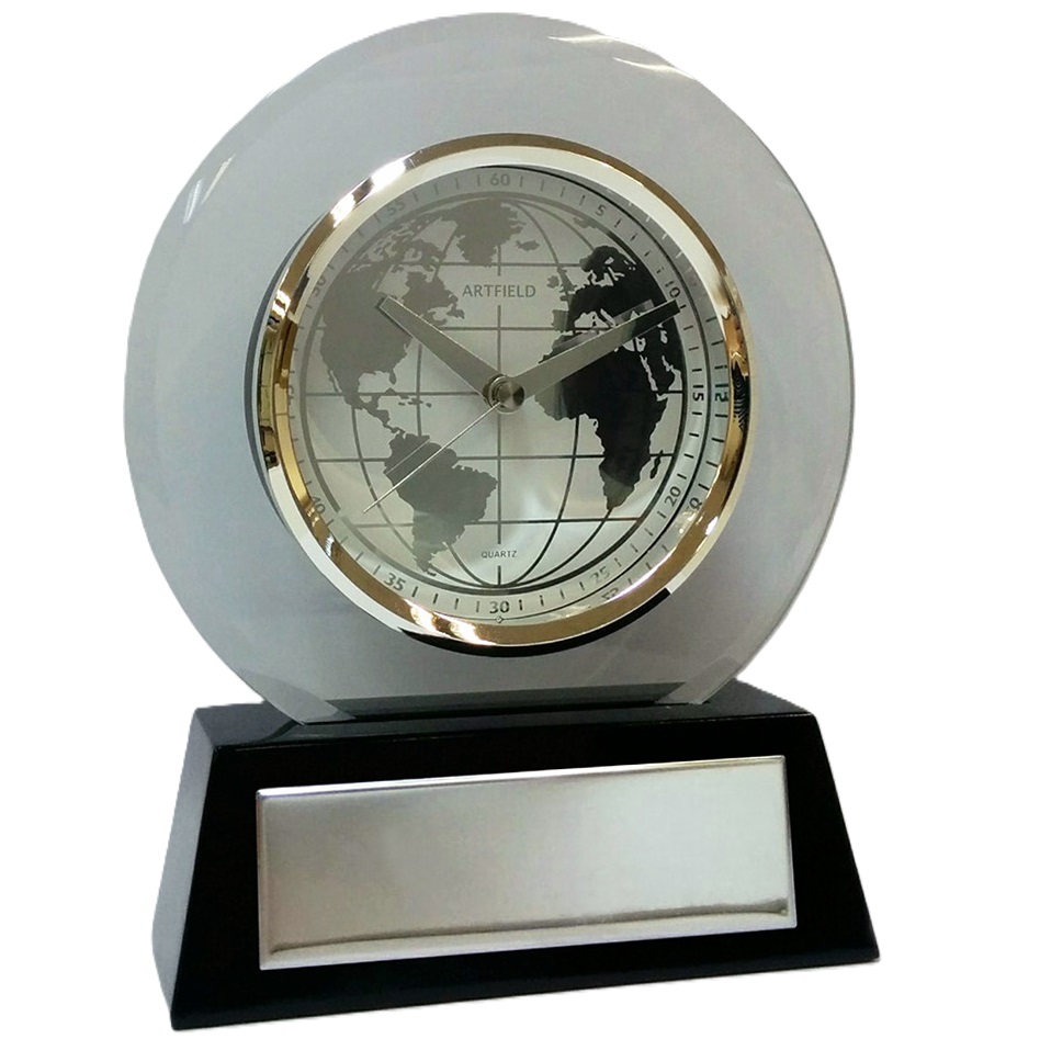 Map printing on the metal dial face; Glass upright and MDF base in glossy black finish; With metal engraving plate; Large engraving area; Suitable for corporate gifts and office.