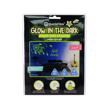 • QuickFilm™ Glow-In-Dark Wall Decoration Stickers do not contain glue, can be moved easily, and leave no trace behind. It can be adhered to any smooth surface such as walls (including painted walls), ceilings, furniture, fridges, round surfaces, glass, etc. With one easy tear-and-paste motion, you can instantly renew the look of your interior, bringing constant freshness to your environment.