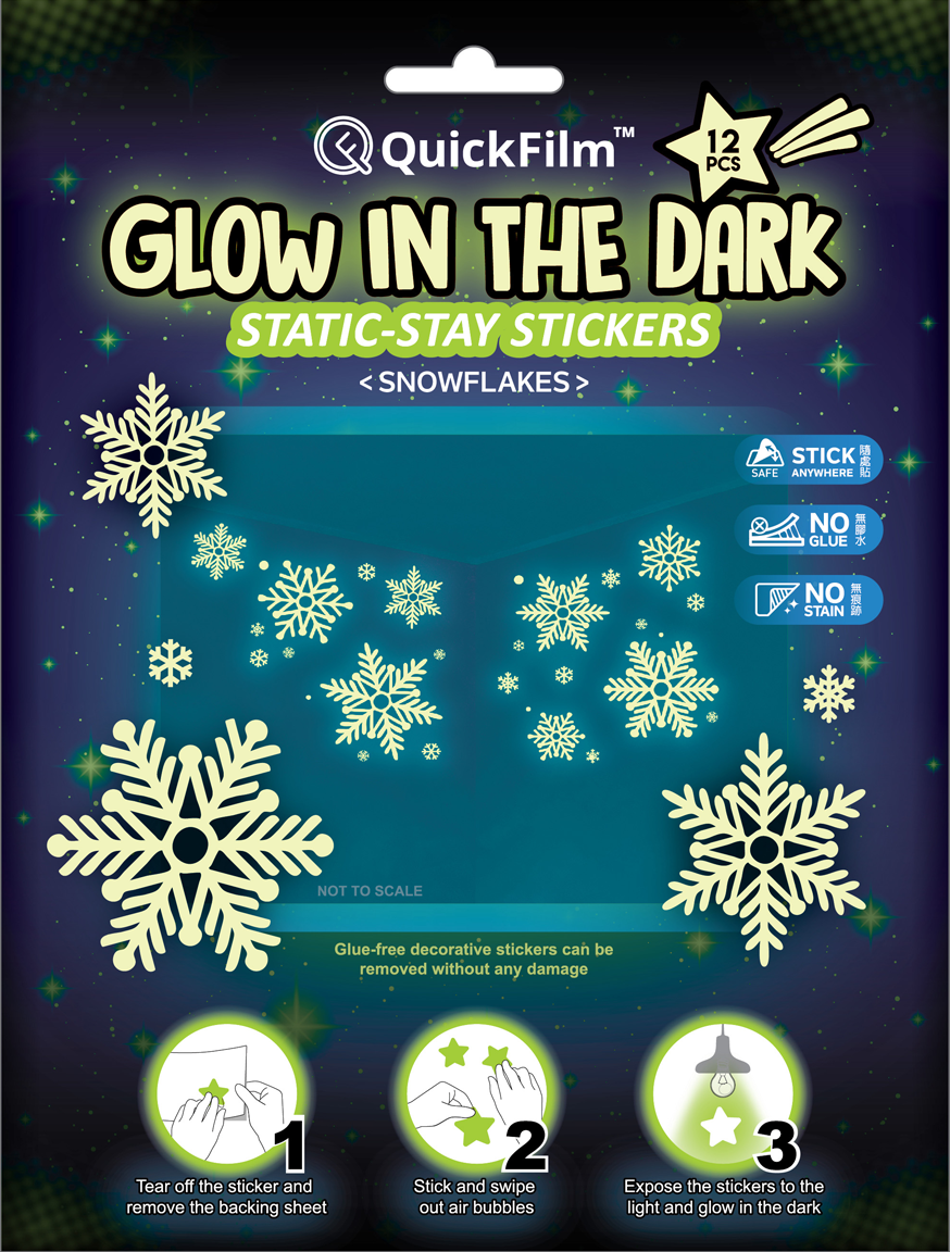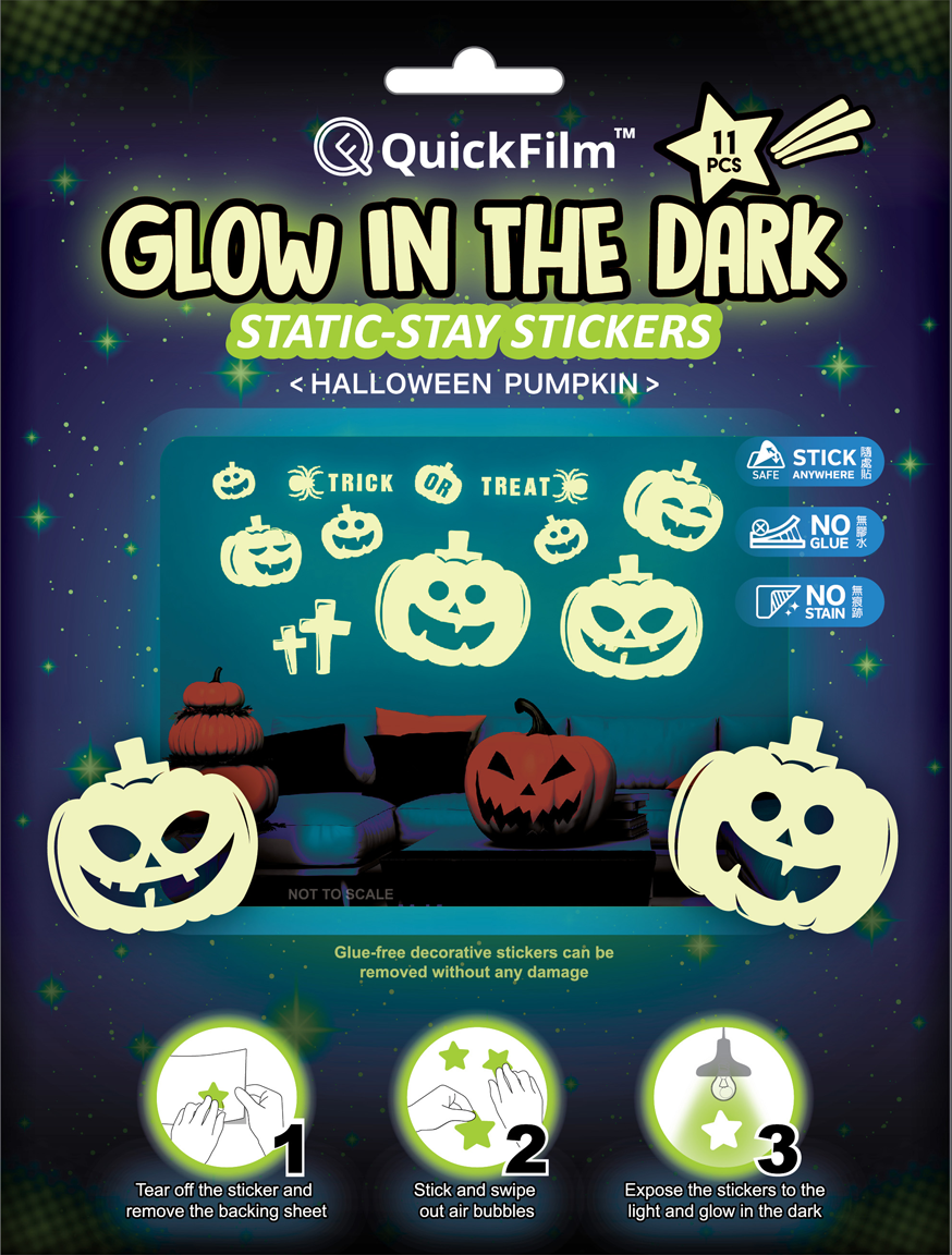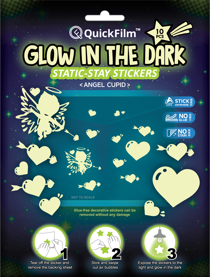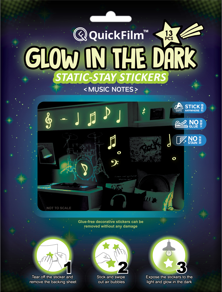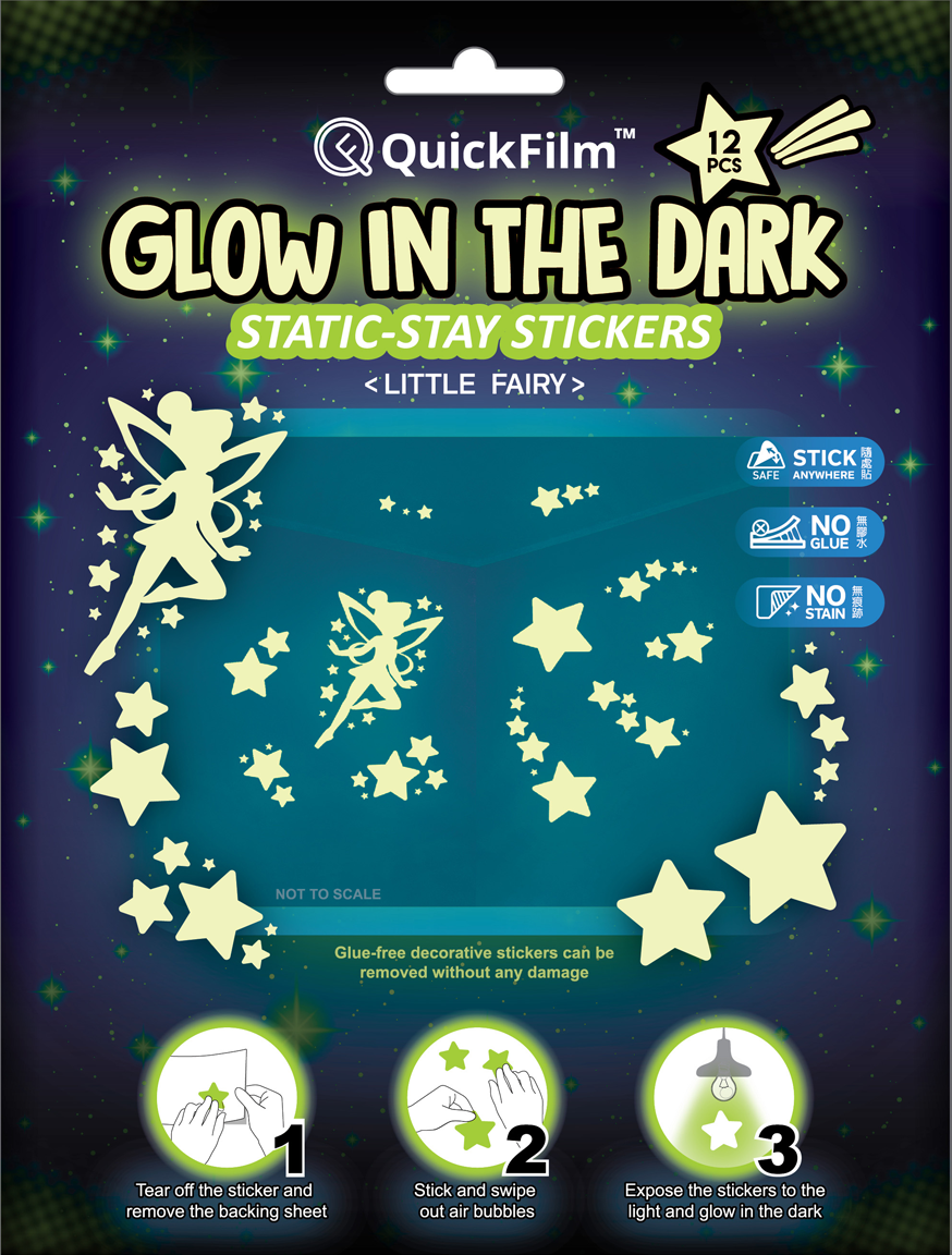 QuickFilm™ Glow-In-Dark Wall Decoration Stickers do not contain glue, can be moved easily, and leave no trace behind. It can be adhered to any smooth surface such as walls (including painted walls), ceilings, furniture, fridges, round surfaces, glass, etc. With one easy tear-and-paste motion, you can instantly renew the look of your interior, bringing constant freshness to your environment.