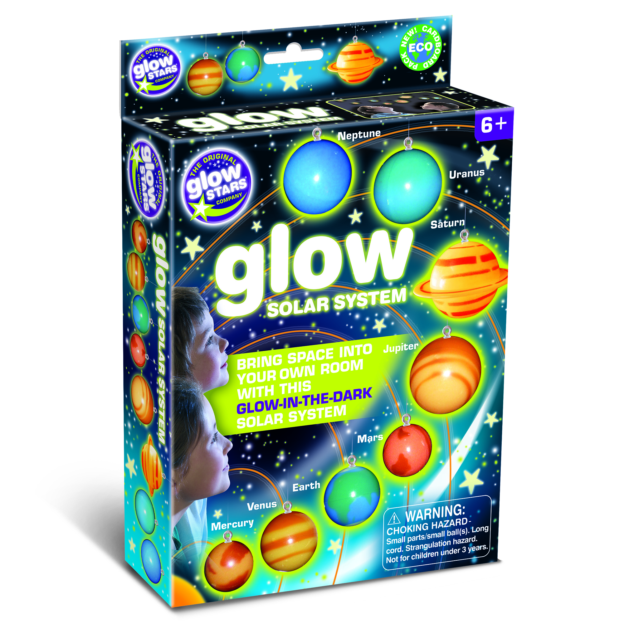 Bring space into your bedroom with this glowing model solar system. Use the clear string to hang eight planets from your ceiling. Detailed on the packaging are the names of each planet so you can display them in their positions within the Solar System. This product is educational and makes a fantastic room decoration. By day the planets are bright, colourful and fun but then at night-time, when the lights go out, they produce a fantastic glowing display.