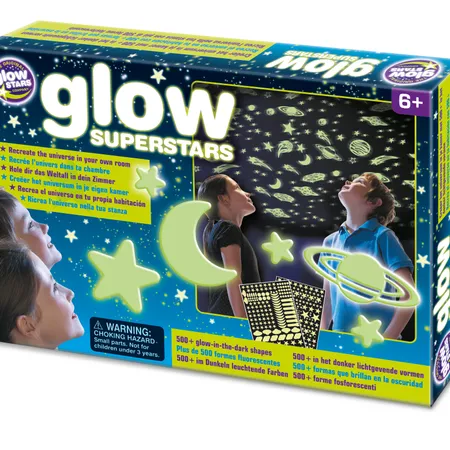 Recreate the universe in your own room using the self adhesive pads provided. Includes 150 plastic glow planets, stars, meteorites and more. Plus over 350 The Original Glowstars Company paper glowstars – over 500 glow shapes in total. Includes fun space facts leaflet.