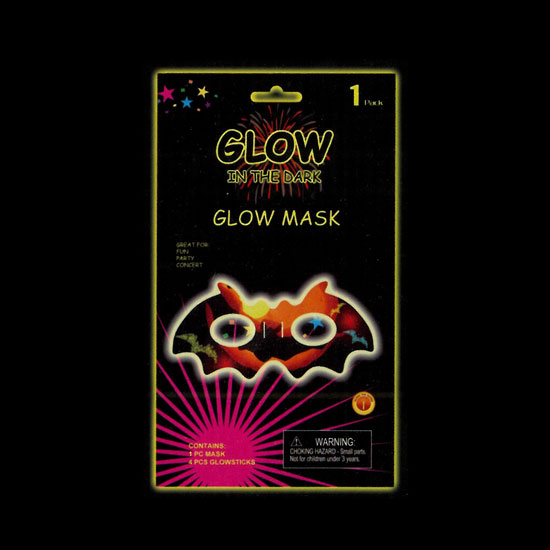 This glow mask comes in the shape of a bat. This glowing bat mask contains a mask and four glow sticks. The bat mask will glow in the dark when it is used together with the glow sticks. It is perfect for people to wear to parties or concerts.